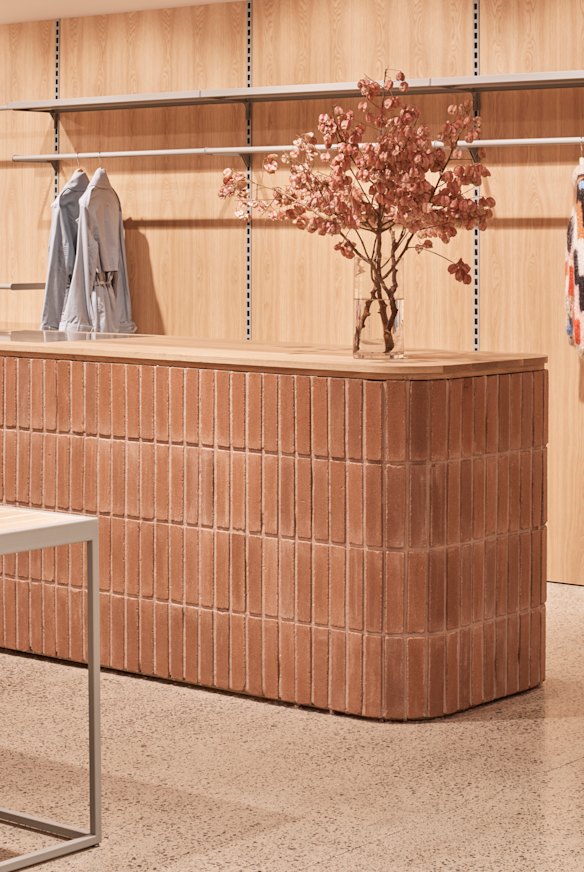 “The facade is constructed using red dry-press bricks in a variety of patterns. They have a beautiful earthy quality and deep yet subtle tone to them,” he says. Bringing the bricks inside, he designed a generous retail counter, with curved edges, using the terracotta brick to form the base.
