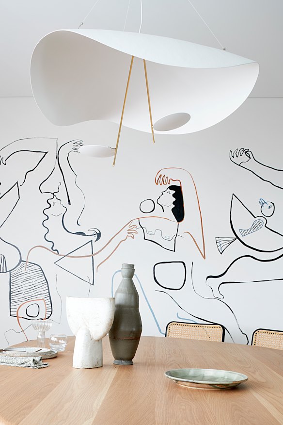 Drawn to the free-flowing work of Los Angeles-based artist Jessalyn Brooks, the open brief led her to commission two murals from Brooks, one for the foyer, the other the dining room (pictured).