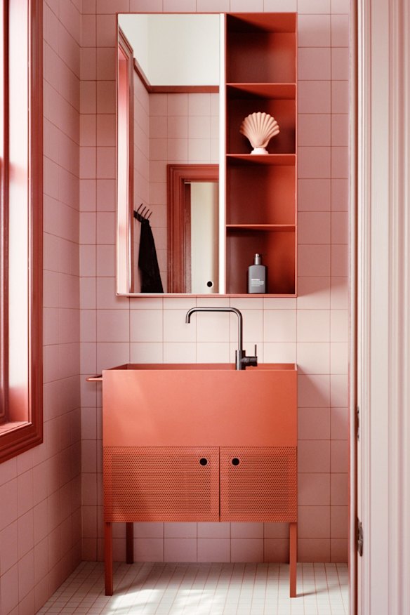 Renovating this Edwardian home in Melbourne’s Northcote, architects Studio Bright decided to insert new functional elements that contrast sharply with the house’s period features. Take this ensuite to the main bedroom, for example, where heritage details such as the architraves are picked out in colour, while the custom-designed basin and shelving are linear and contemporary.