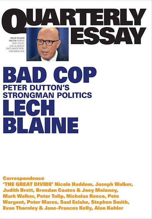 This is a portrait drawn in black and white of a man – Peter Dutton – who seems to see the world in black and white. As Lech Blaine tells it, Dutton’s stint in the police force hardened and traumatised him, leaving him with a disdain for immigrants, welfare recipients and Indigenous peoples. “Dutton is a punisher. His desire to discipline the vulnerable comes from a visceral place ... [P]ower is a means to punishment.” At the same time, says Blaine, his ex-cop persona conveniently distracts attention from Dutton the wealthy property investor. When it comes to a serious debate about inflation and tax reform, he has little of substance to offer, opting for inflammatory remarks on identity politics and the culture wars. The thrust of this punchy essay is that Dutton’s strongman guise is a cover for a deeply ambitious and ruthless individual who is, in fact, “small and scared”.