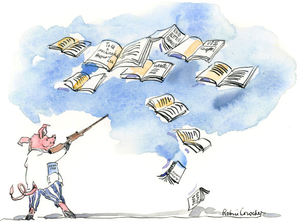 And there’s Enid Blyton’s Famous Five, once a quintet of prepubescent privileged white busybodies, now five genders, sexualities and races, and none capable of voicing a heterodox thought. Over in the Ws is Patrick White’s Voss. Every sensitivity sheriff who’s had a grievance with it for a century has chipped away at it like a conga line of Puritan vandals at David’s marble member, until it isn’t so much Voss as the dross that was Voss. Agatha Christie? That old hate-monger’s work’s had to be eviscerated to where they’re mere mental massages, little more than platforms for happy endings.