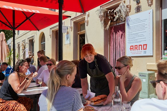 Launched by chef Will O’Brien in 2022, Arno is a tiny paninoteca and wine bar in the centre of Newcastle. White tiles. Forest-green menu board. Cardinal-red smallgoods scales. Lovely stuff. Every weekend there’s a throng of 20-something Novocastrians in various stages of beachwear and hangover waiting for, say, a rare roast-beef sandwich with red pesto, salsa verde and ricotta. When I lived in Newcastle 20 years ago, the pinnacle of meat-in-bread was a chicken tikka naan wrap from Darby Raj.