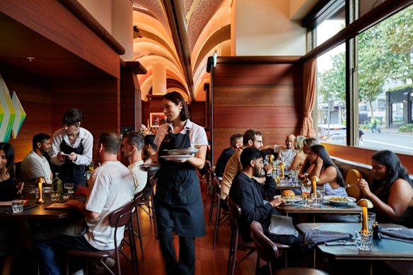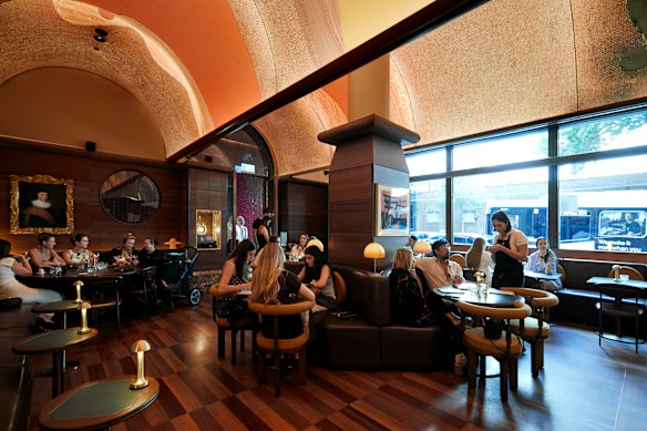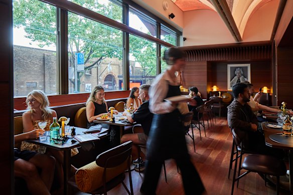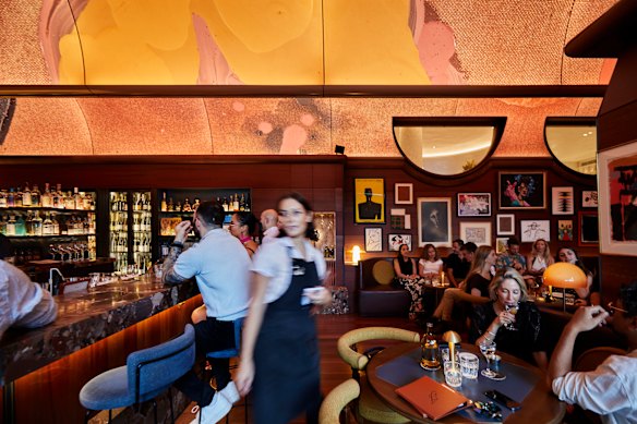 Sign upIt’s run by Liquid and Larder, the same group that operates hatted Mexican restaurant Lottie on The Eve’s rooftop and CBD steak joints The Gidley and Bistecca. The service isn’t quite as polished as The Gidley, but staff are friendly and invested, and classic cocktail requests are met with enthusiasm and sound execution. SJB studio is responsible for the fitout, which is a beautiful space of redgum flooring, contemporary art, layered marble and warm backlights. The vaulted ceiling with artwork by Louise Olsen is worth the admission price alone (which I suppose is a $5.50 bowl of house-marinated olives).