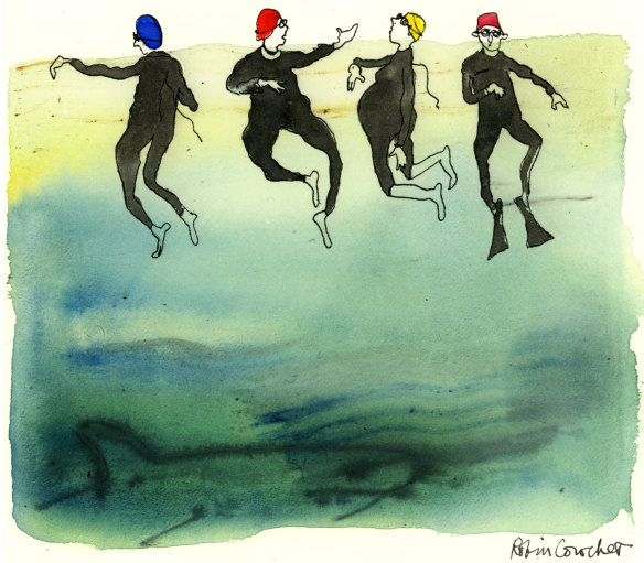 Mostly, I keep pace with octogenarians, folk recovering from ladder falls, vicars composing sermons while afloat, and women in their third trimester ... swimmers burdened by embryos, age and ideas. We stop to rest, hanging in the water, a flotilla of brightly capped heads in the chop. Life seems precarious when you’re lip-deep in brine a long way from land, you get the feeling you’re sharing precious moments, even end times. An unspoken intimacy forms, as it does between passengers on a jet with one engine out. Experience is heightened, the sun develops an ineffable hue and you share repartee freely with anyone – even a vice-chancellor. Danger, memento mori, the near miss, the glimpse of the abyss, the whiff of mortality ... these make us more empathetic.