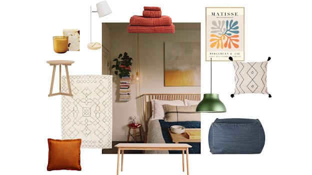 Where to buy: Inka Arthouse Papiers Coupes print by Henri Matisse, from $50. Hay “PC” pendant light, $335. Muji “Beads Sofa” bean bag (available in-store), $149. Madras Link “Caribu” cushion, $75.