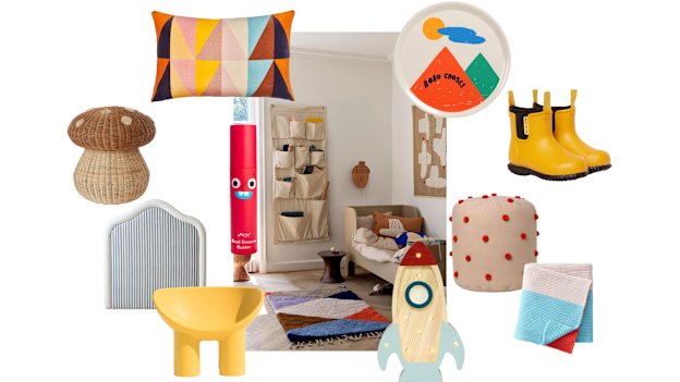 Where to buy: Castle & Things “Triangle” velvet cushion, from $69. Merry People “Bobbi” gumboots, $80. Bobo Choses “Landscape” tray, $43, from Kido Store. Gro-To “Bad Dream Buster”, $12.50, from Go-To.