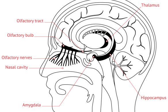 Of all the senses, smell (which is connected to taste) has a direct link to our limbic system, the amygdala and hippocampus, which process emotion and memory. They are connected to the olfactory bulb at the front of the brain, which receives the information in odour molecules when you sniff. Some scientists think smell and emotion are stored as one memory, although how memory is stored in the brain is still being discovered. The information our brain receives from vision, hearing and touch, on the other hand, goes to a relay station, the thalamus, before it reaches the “emotional” parts of the brain.