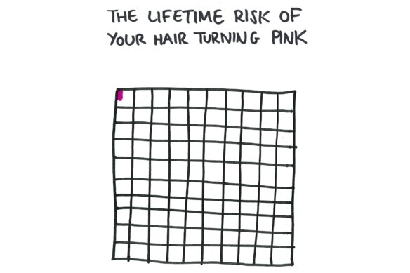 If you’re reading this article on mobile, you might have had to squint to see the difference between the two grids. Even though, in our faux example, coffee drinkers have an eight times higher risk of their hair changing colour, most of the squares in the grid are blank – irrespective of whether you drink coffee or not, you are far more likely to go your entire life without your hair turning pink.