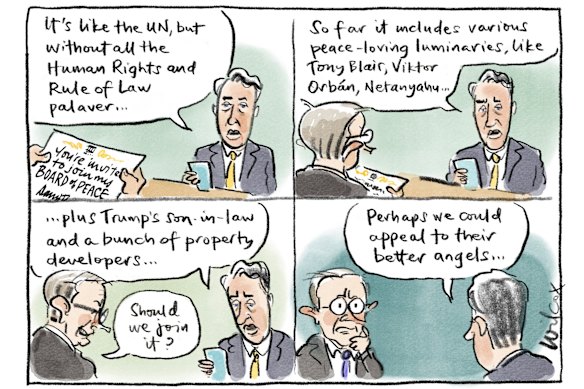 Canadian Prime Minister Mark Carney seems alone among world leaders in being prepared to decidedly take on the bully authoritarian, now president of the US (“Trump threatens Canada with 100 per cent tariffs amid feud over China ties”, January 26.) Carney’s Davos speech, in which he said that the rules-based world order was now dysfunctional and should be replaced, and his call for stability and peace, made me wonder if he could be a candidate for the 2026 Nobel Peace Prize. The mere thought of that possible scenario would render the irascible Donald Trump apoplectic. Bernard Moylan, Bronte