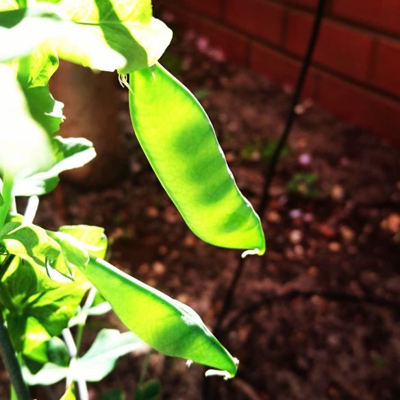 My snow peas plant has grown taller than me. I took a photo and asked my kids to find the snow peas. - Anonymous