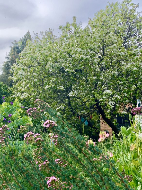 Pear blossom, sweet pea and Geraldton wax in Caulfield. - Maggie