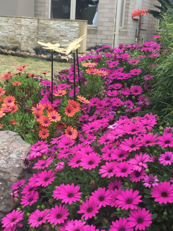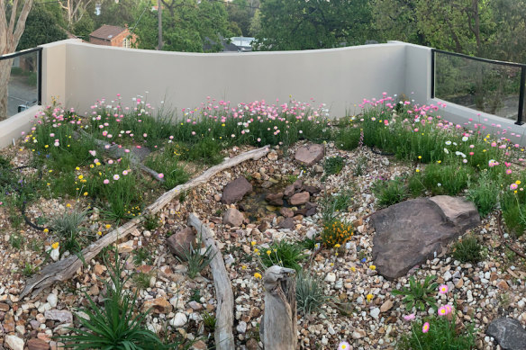 My garage roof garden is my retreat. Above the world and covered in Australian natives. It's only been planted six months, but everything is flowering like crazy. Bees, hover flies, spiders, birds, and lizards already call it home. Annual pink, white and yellow paper daisies are mixed in with small perennials like Flannel flowers, Trigger plants, Albany daisies, Goodenias, Chocolate lilies and Billy buttons. - David Lightfoot