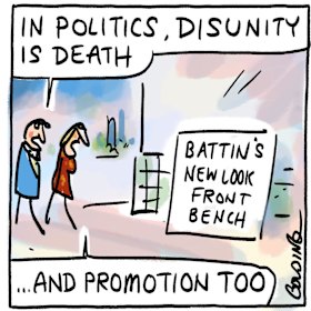 Also receiving a promotion in Tuesday’s reshuffle was Evelyn MP Bridget Vallence, the former industry spokeswoman, who received the finance portfolio. Vallence was another MP photographed walking into parliament last week alongside Battin the day he challenged for the leadership.