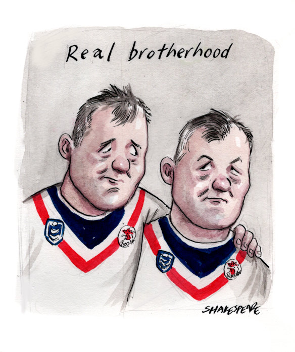 The juxtaposition to that day of disgrace for rugby league was the scene last Saturday night after Roosters veteran Brett Morris tore his ACL in the match against the Knights. After the match, as the enormity of the fact that his career was very likely over at the age of 34, Morris teared up, only for his twin brother Josh to come over, embrace him, hold him, whisper to him and then – shifting the young prodigy Joseph Suaalii out of the way – sitting beside him.