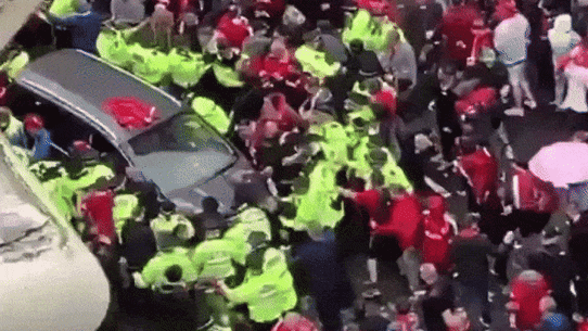Separate footage showed another fan wearing a Liverpool banner opening the car door as it stopped reversing, before the driver pulled it shut and drove forward into the throngs of people on Water Street.
